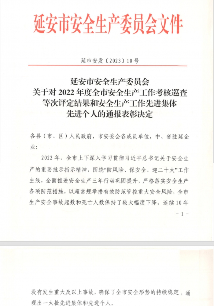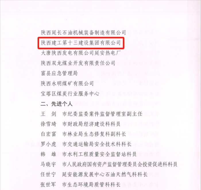 近日,延安市安全生產(chǎn)委員會表彰了2022年全市安全生產(chǎn)工作先進(jìn)集體和先進(jìn)個(gè)人,陜建十三建集團(tuán)獲評延安市安全生產(chǎn)先進(jìn)集體,這是集團(tuán)連續(xù)四年榮獲全市安全生產(chǎn)先進(jìn)集體表彰。